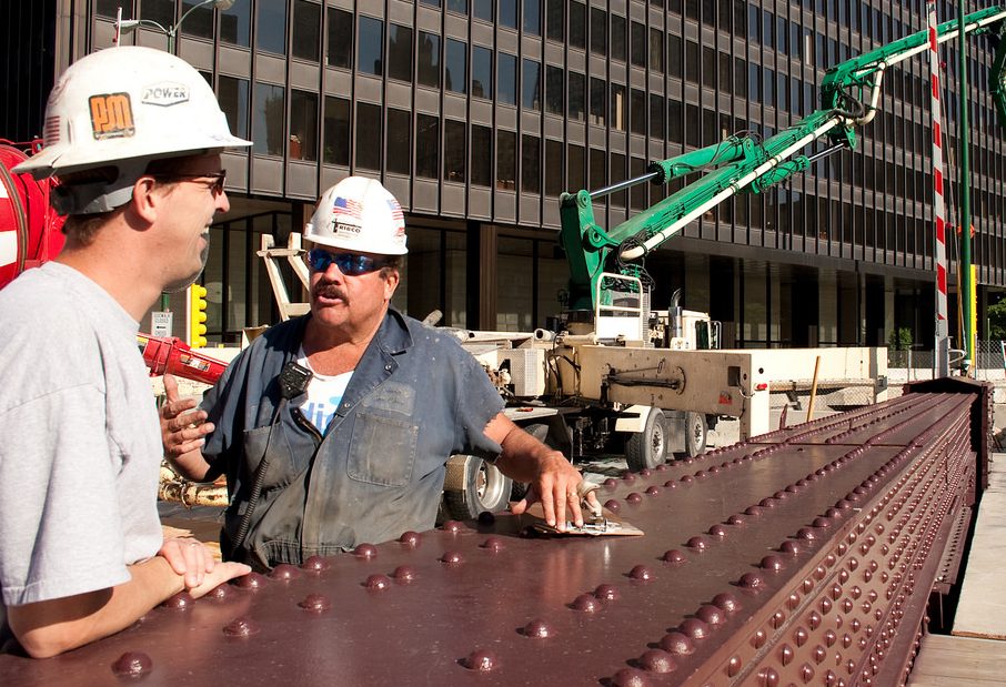 Construction workers discuss a bridge redevelopment next to Trump Tower in Chicago. Robert Gigliotti / Flickr