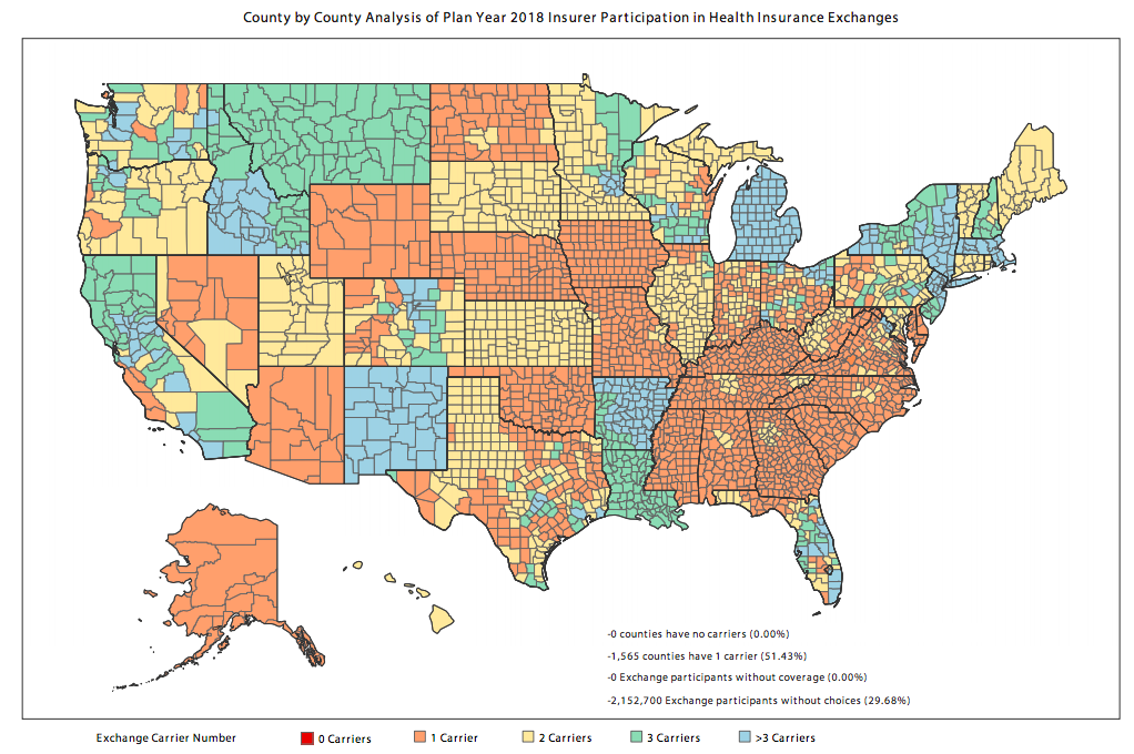 The situation is even worse in single-insurer counties, which now make up more than half of the counties in the US. Alabama residents, for example, are only able to purchase ACA plans through Blue Cross Blue Shield, which requested a 15 percent increase in premiums for 2018. And many of those single-insurer counties are rural, lower-earning places.