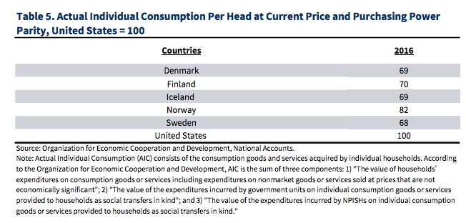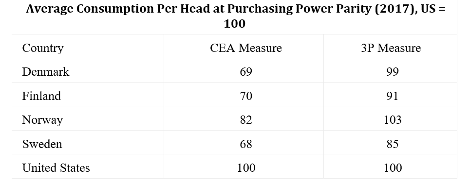 According to this measure, Danes, Finns, and Swedes have a standard of living that is 30 percent worse than Americans. For Norwegians, it is only 18 percent worse.