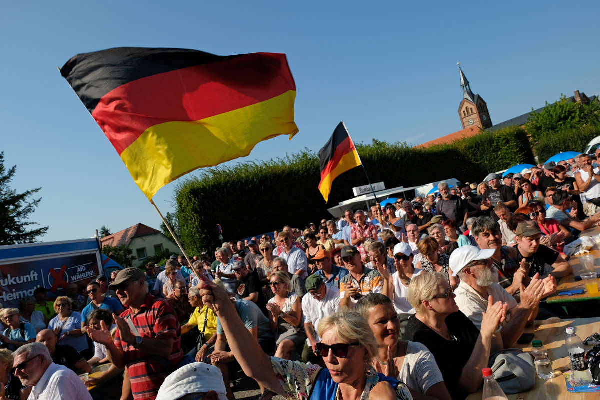 Supporters of the right-wing Alternative für Deutschland (AfD) political party wave German flags as they listen to AfD speakers campaigning for the Brandenburg state elections, on August 25, 2019 in Peitz, Germany. (Sean Gallup / Getty Images)