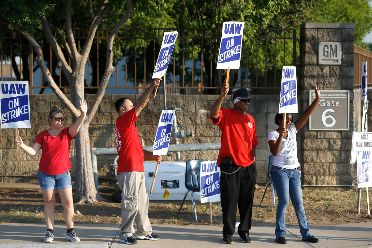 Members of the United Auto Workers union protest outside the General Motors Arlington Assembly plant on September 16, 2019 in Arlington, Texas. (Ron Jenkins / Getty Images)