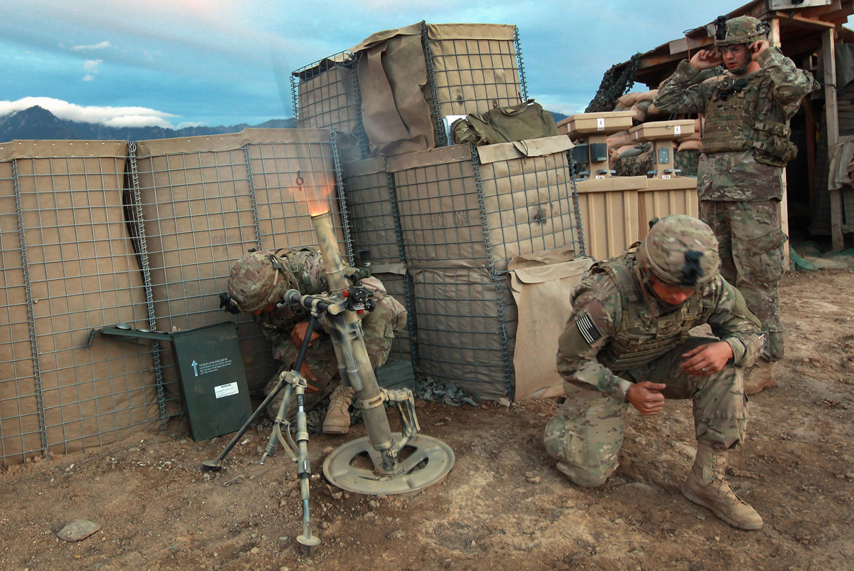 Men from the US Army fire on a Taliban position from Observation Post Mustang on September 2, 2011 in Kunar Province, Afghanistan. (John Moore / Getty Images)