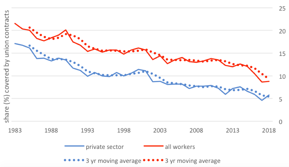 Since 1947, Iowa has been a “right-to-work” state — a fact it proudly advertises to prospective employers and investors. Union density is only 5.8 percent in the private sector and just 12 percent in manufacturing — a sector increasingly dominated by staffing services and contingent employment. In early 2017, the GOP-controlled legislature gutted public sector bargaining by dramatically narrowing the scope of negotiation, capping wage increases, and subjecting bargaining units to onerous (and undemocratic) recertification procedures. To their credit, the state’s public sector unions have taken this on as a bargaining opportunityand lost little ground to date — but if the experience of Wisconsin is any indication, even keeping union density steady will be hard to sustain.