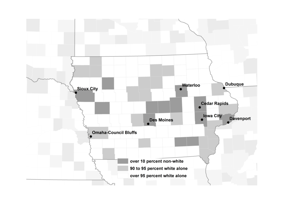 In its broader demographics, Iowa looks decidedly unlike the rest of the country. As of 2017, over 90 percent of the population identified as white alone, 3.4 percent identified as black alone, and 5.7 percent identified as Hispanic (of any race). In fully seventy-two of Iowa’s ninety-nine counties the non-Hispanic white population was over 90 percent, and in eighty-nine of ninety-nine counties the African-American population was under 3 percent.
