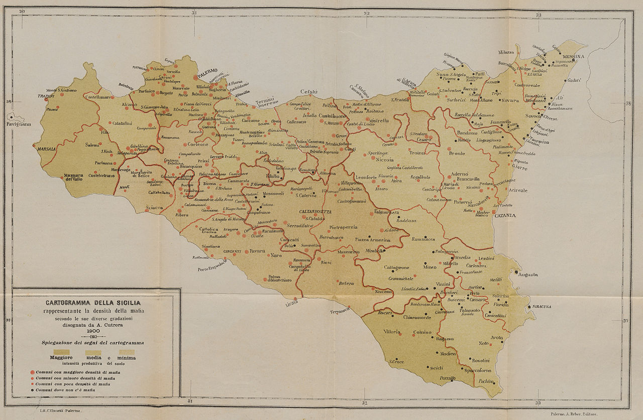 A map marking towns with Mafia activity in Sicily in 1900. Towns with Mafia activity are marked with red dots. Towns with no Mafia activity are marked with black dots, 1900.Antonino Cutrera / Wikimedia