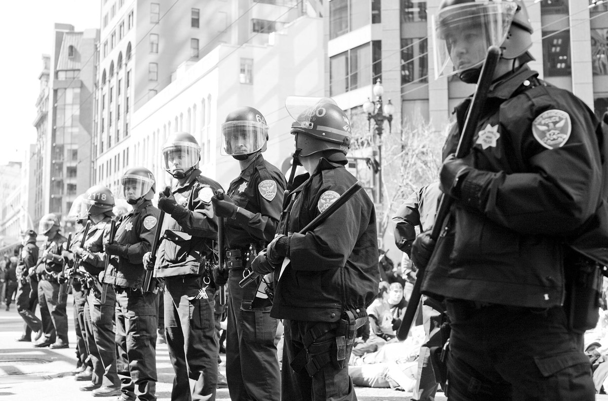 Police lined up at Union Square in San Francisco, California. (Thomas Hawk / Flickr)
