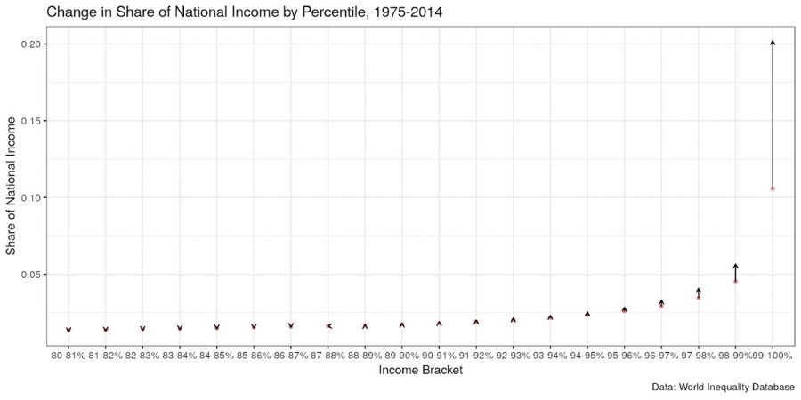 But the story of the top 20 percent is more complicated. Outside of the top 1 percent, there hasn’t been much change. In fact, all income brackets below the top 13 percent are taking home a smaller slice of the pie than in 1975. Even the almost rich, those in the ninety-eighth to ninety-ninth percentile, just below the 1 percent, only saw their share of national income increase from about 4.5 to 5.6 percent of the total.