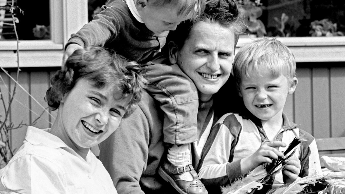 Olof Palme with his wife, Lisbeth, and their elder sons, Joakim and Mårten, in the garden of their home in a suburb of Stockholm in 1964.