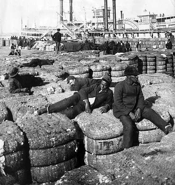 White and black dockworkers resting on cotton bales in the port of New Orleans. (B. L. Singlay)