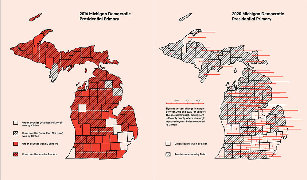 In 2016, Bernie won a major upset in Michigan, thanks in part to a groundswell of support in the state’s rural areas. In 2020, he lost every county in the state — and the numbers show he lost many of his rural supporters, too.