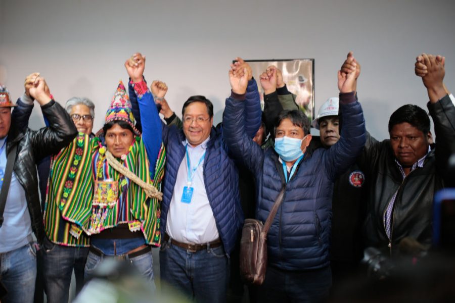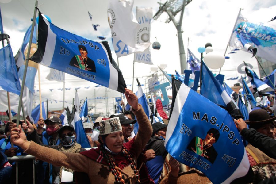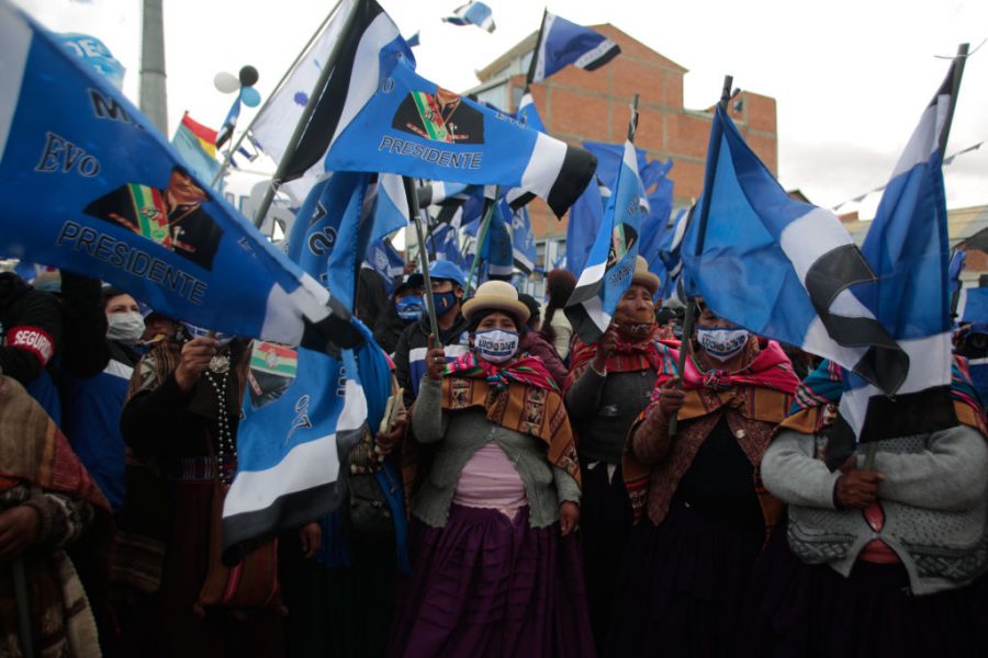 Supporters of MAS (Movement Toward Socialism) candidate Luis Arce wave flags during a celebration the day after general elections on October 19, 2020 in La Paz, Bolivia. (Gaston Brito Miserocchi / Getty Images) The second element is that the people have been able to compare and contrast. The opposition that for fourteen years questioned and denounced MAS’s political project, our democratic and cultural revolution, itself exercised power [over most of 2020], demonstrating its inefficiency and inability to manage the state apparatus. More fundamentally, it acted politically in compliance with the class interests to which it corresponds. And in that contrast, people could see how they were a year ago and how they were now, how their life was organized a year ago, how their finances were planned. Now all that has collapsed, not only because of the health crisis but because of poor management of public affairs.