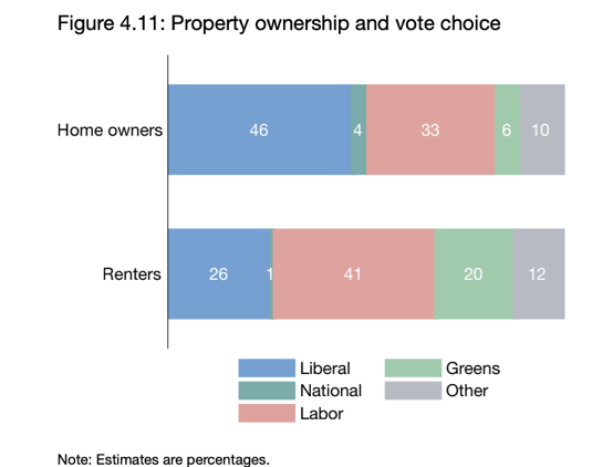 The rise of the renter is by far the most important determinant of a growing Green vote. The 2019 ANU Electoral Study found that the Greens polled at 20 percent among renters nationwide, compared to 6 percent among property owners. When measured against income and education differentials, the divide is much less stark. Among people with no post-school qualifications, the Greens poll at 11 percent, against 17 percent among those with university education.