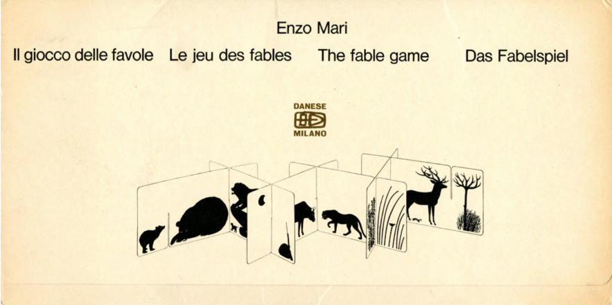Probably the prelude to Autoprogettazione was The Fable Game (1965), a book for children to take apart and put back together again. The Fable Game consisted of six sheets of card with animals and some elements of their habitat printed on either side. The sheets could be slotted into each other, building landscapes on which to play at inventing stories.