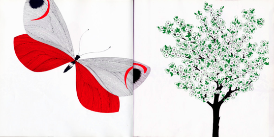 But back to games. In the 1960s, Mari and his first wife Leila designed a series of children’s books, which portrayed the cycles of nature without the help of words. The Apple and the Butterfly told the story of a caterpillar that hatches and grows in the core of an apple. Then comes its metamorphosis into an adult with wings, its hovering through the trees, and its pollination of a flower — thus leading to a second apple. The cycle of life, from one apple to another, is broken down into its stages, and portrayed with a style of illustration that is sparing with both details and colors.