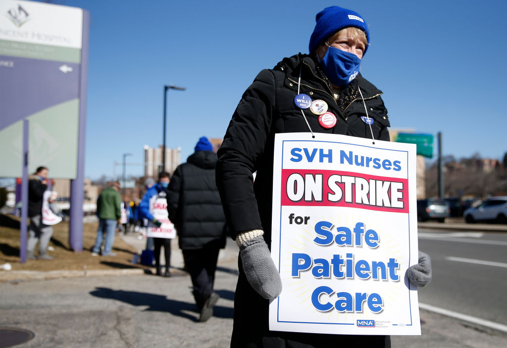 Nurses on the picket line during a strike outside of Saint Vincent Hospital on March 8, 2021, in Worcester, Massachusetts. (Jessica Rinaldi / The Boston Globe via Getty Images) Wen Zhuang