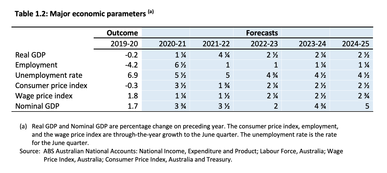 Overall, with the JobKeeper scheme due to be wound down, federal government spending will actually fall over the next fiscal year. The budget predicts that unemployment will slowly fall to 4.5 percent. Over the medium term, its forecasts envisage a slow and grinding recovery after stimulus spending winds down.