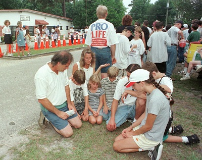 Operation Rescue is the most notorious of the early groups to target abortion clinics. Founded by Randall Terry in 1986, their slogan was “If you believe abortion is murder, act like it’s murder.” They rose to national prominence when over 1,200 Operation Rescue activists were arrested protesting at the 1988 Democratic National Convention in Atlanta, and in the following years, branches and independent rescue organizations popped up around the country.