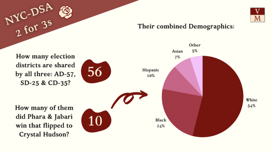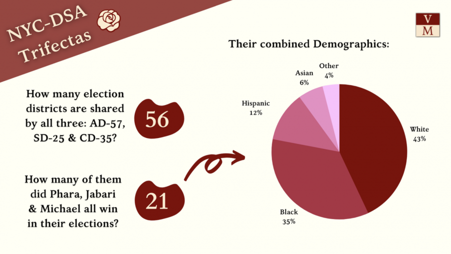 In total, there are fifty-six precincts shared by AD-57, SD-25, and CD-35. Of those, twenty-one went for all three candidates endorsed by NYC-DSA in 2020 and 2021. These DSA trifecta precincts are somewhat whiter than the districts in which they’re located, but are still majority non-white and more than one-third black.