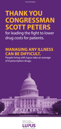 “Thank you Congressman Scott Peters for leading the fight to lower drug costs for patients,” the ads say. “Managing any illness can be difficult. People living with lupus take an average of 8 prescription drugs.”