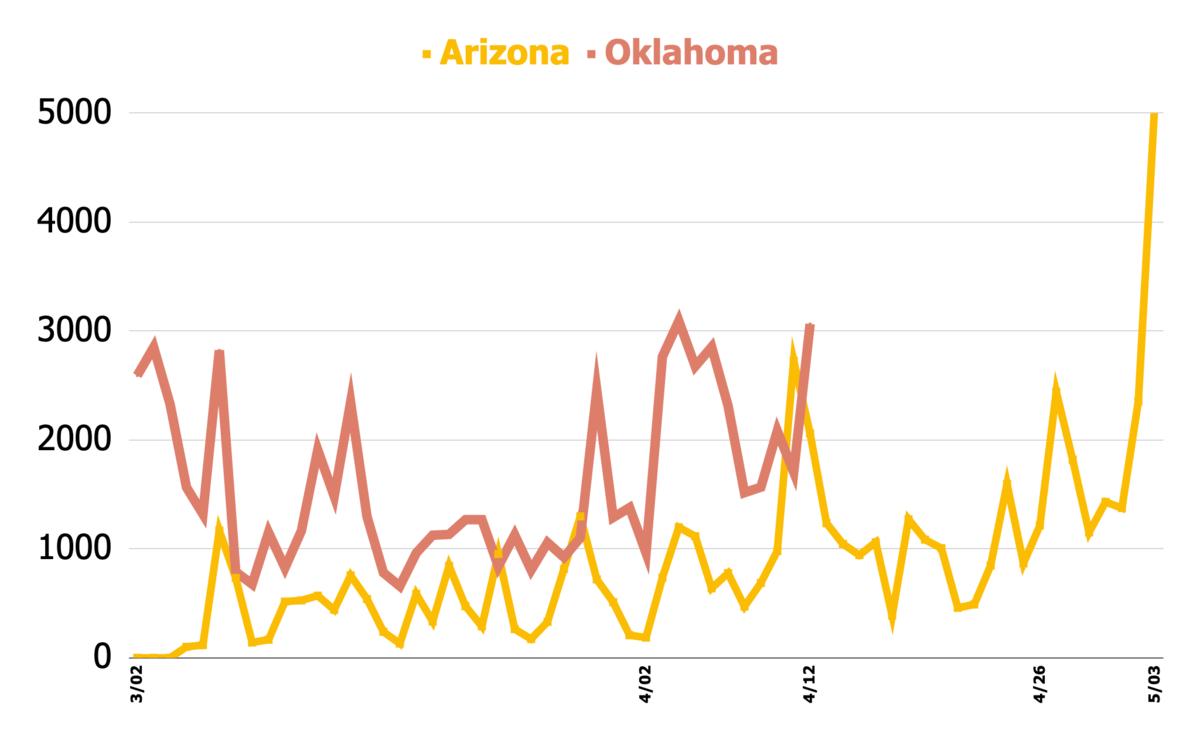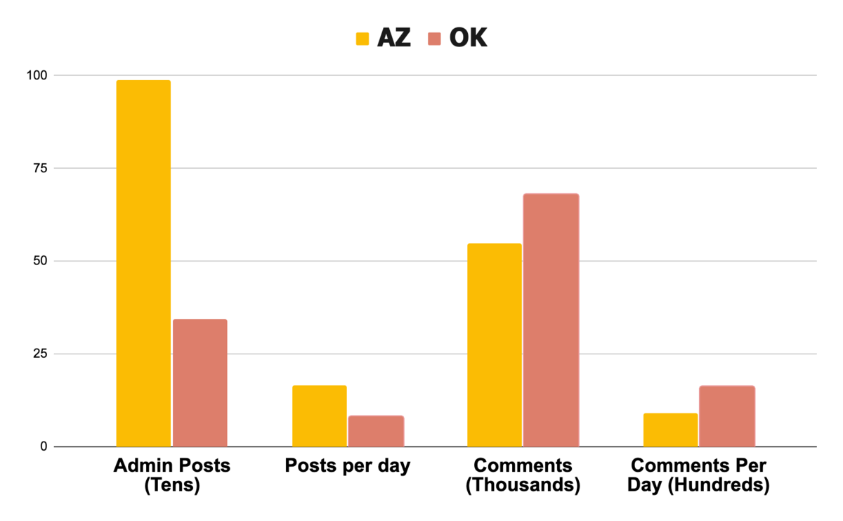 Yet the fact that AEU had eight leaders, each providing roughly the same level of labor, gave them a significantly greater communication and organizational capacity than in Oklahoma. As seen in figure 2, Arizona’s admins had a daily post average of 16.5 — versus 8.2 in Oklahoma. And even more important than the quantity of their digital output was its content: Arizona’s leaders focused on encouraging educators to win over their coworkers and the community to support a strike, while Morejon focused primarily on agitating those who already supported the movement.