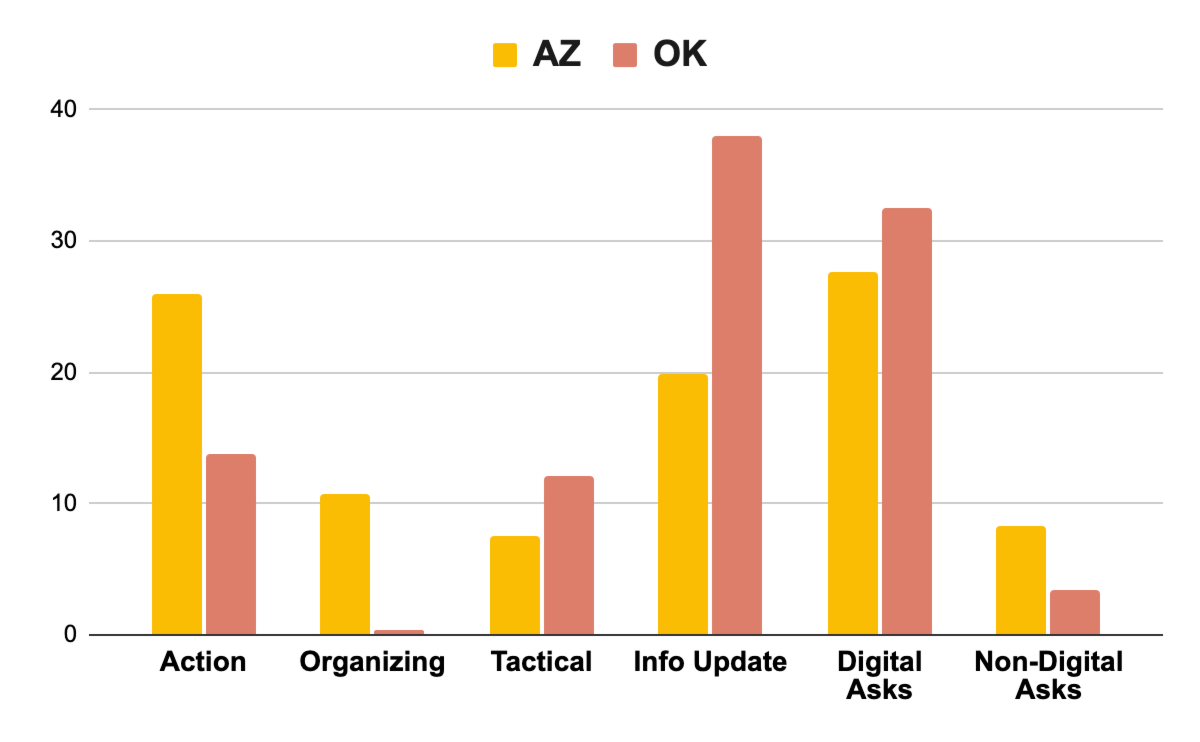Oklahoma and Arizona’s divergent digital strategies illustrate the differences between mobilizing and organizing models, as outlined in figure 3. Because Oklahoma’s group relied entirely on Facebook and didn’t create any organizational apparatus, it was unable to target and focus on winning over hesitant schools or educators.