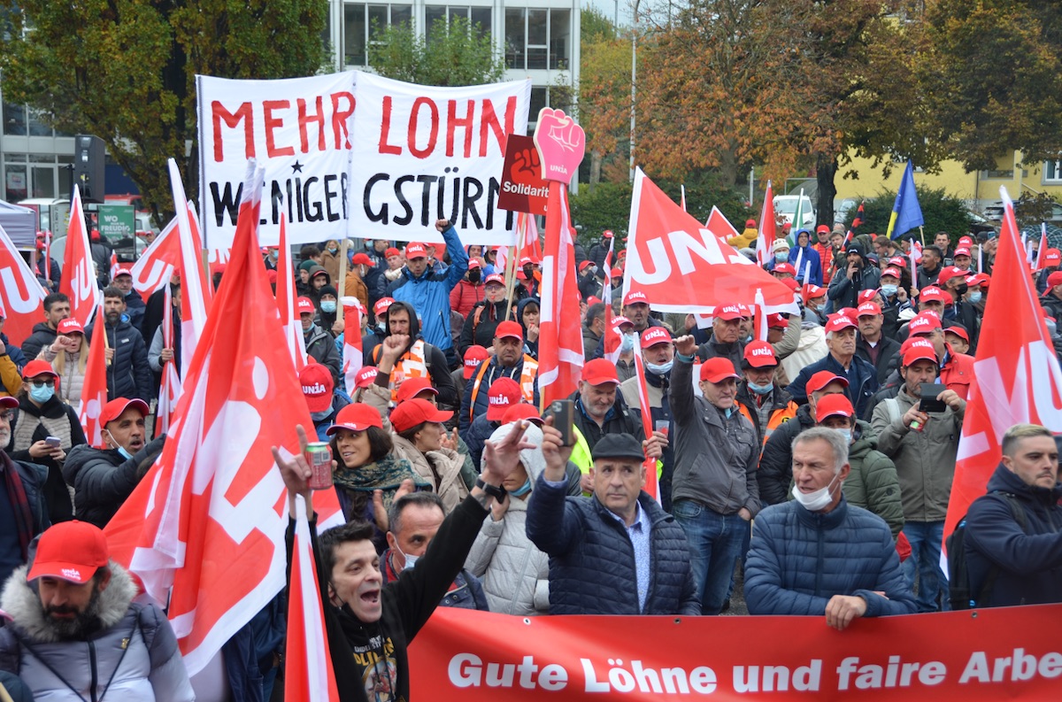 Thousands of construction, logistics, and health care workers took to the streets of various Swiss cities in October 2021 to demand higher wages and better working conditions. (Philipp Zimmermann / Unia)