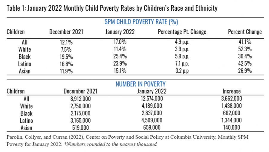 According to newly released data, an astonishing number of children have entered poverty in a very short period of time. The research, published by the Center on Poverty and Social Policy at Columbia University, finds that America’s monthly rate of child poverty spiked from 12.1 percent in December 2021 to 17 percent in January 2022 — the highest rate measured since the end of 2020. All told, the jump means that some 3.7 million more children have become poor all at once, with black and Latino children experiencing the most significant increase.
