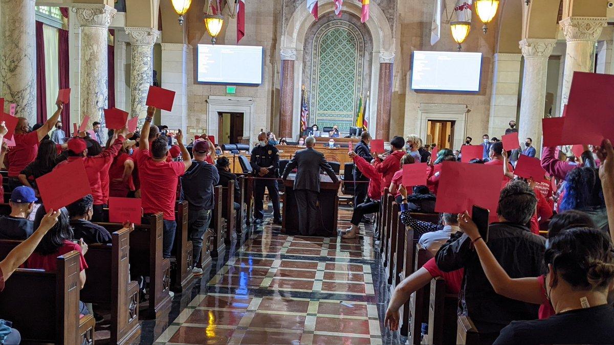 On Friday, May 27, members of the Hillside Villa Tenants Association and their supporters, who had packed the Los Angeles City Council chambers dressed in red shirts and holding signs that read “EMINENT DOMAIN NOW” and “PUBLIC MONEY PUBLIC USE,” erupted in cheers and began chanting “Sí se puede! Sí se puede!” The tenants had just secured a historic win, becoming the first tenants’ association in the United States to successfully force a municipal government to approve the public purchase of their building to preserve affordability.