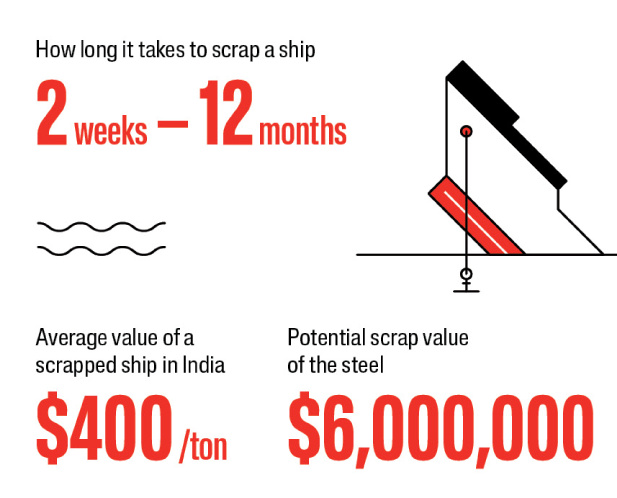 When a ship reaches the end of its life, a shipowner will likely opt to sell it to a so-called cash buyer, often with help from a broker who takes a cut of the sales price. Cash buyers take over responsibility for transporting an old ship to its scrapping destination — and, more nefariously, they allow shipowners to vacate legal responsibility for the labor and environmental circumstances under which ships are recycled. As a result, almost all of shipbreaking happens through the intermediary of the cash buyers, who pay shipowners up front for an old ship, then resell it to the shipbreaking company willing to pay the most for the vessel. Throughout the entire recycling process, stakeholders seek to avoid responsibility for the circumstances under which shipbreakers labor: cash buyers register vessels under new names, flags, and addresses; and shipowners, in turn, conceal the identities of their buyers and pretend ignorance about the shipbreaking industry. Everyone profits — except the shipbreaking workers themselves.