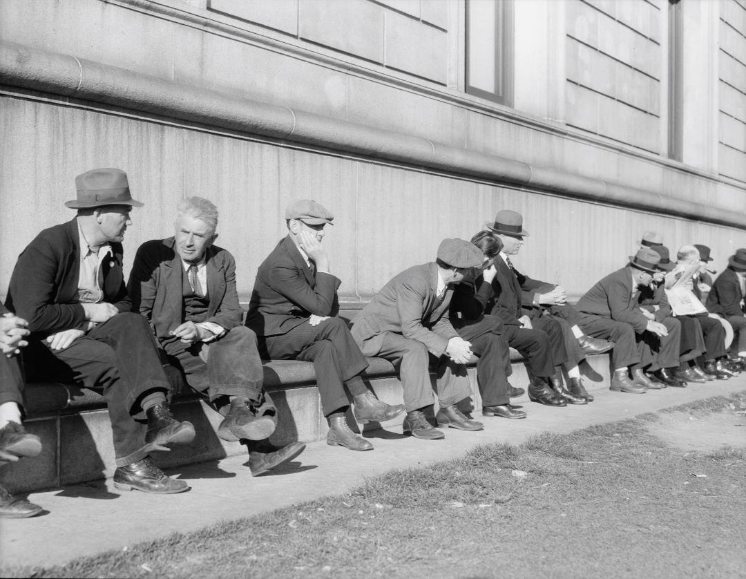 Unemployed men sitting on the sunny side of the San Francisco Public Library in San Francisco, California. (Dorothea Lange / Heritage Art / Heritage Images via Getty Images)
