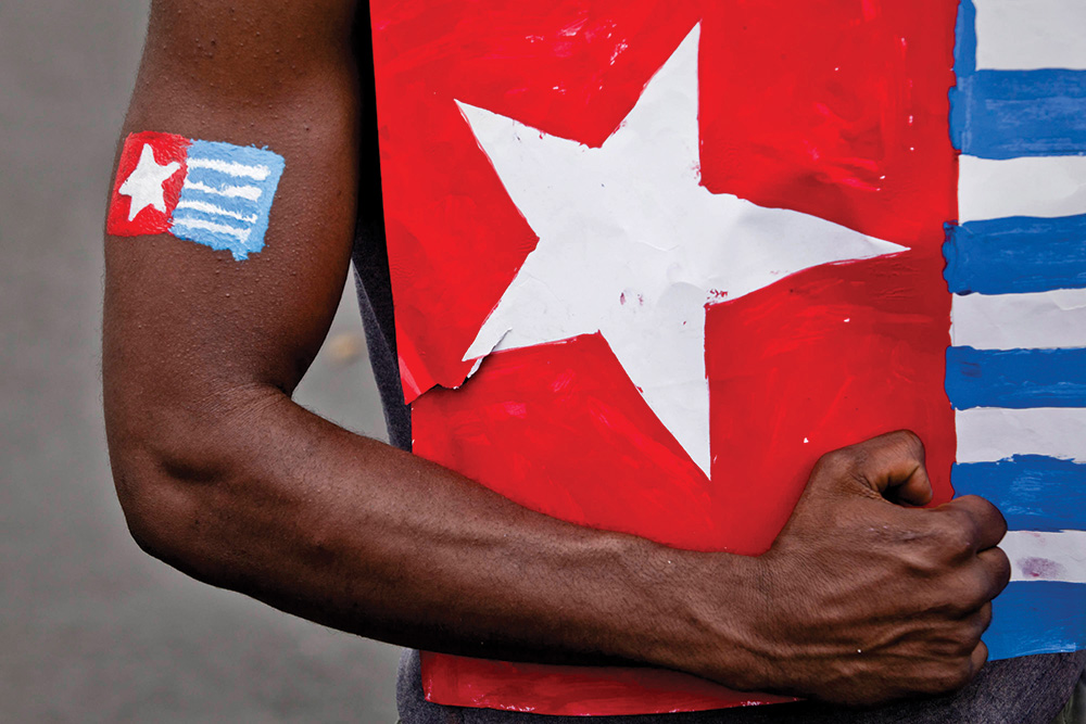 A member of the Papuan Students Alliance bears two paintings of the Morning Star flag during protest against the New York Agreement on the fifty-first anniversary of its signing, August 15, 2013.Getty Images