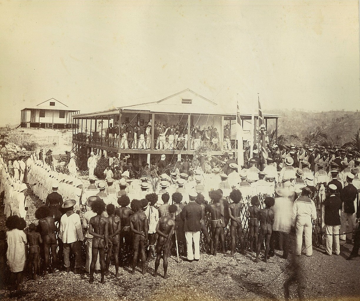 A crowd gathers in New Guinea as a proclamation of British annexation is read in 1884. The territory then became an Australian colony in 1902. (Mitchell Library, State Library of New South Wales via Wikimedia Commons)