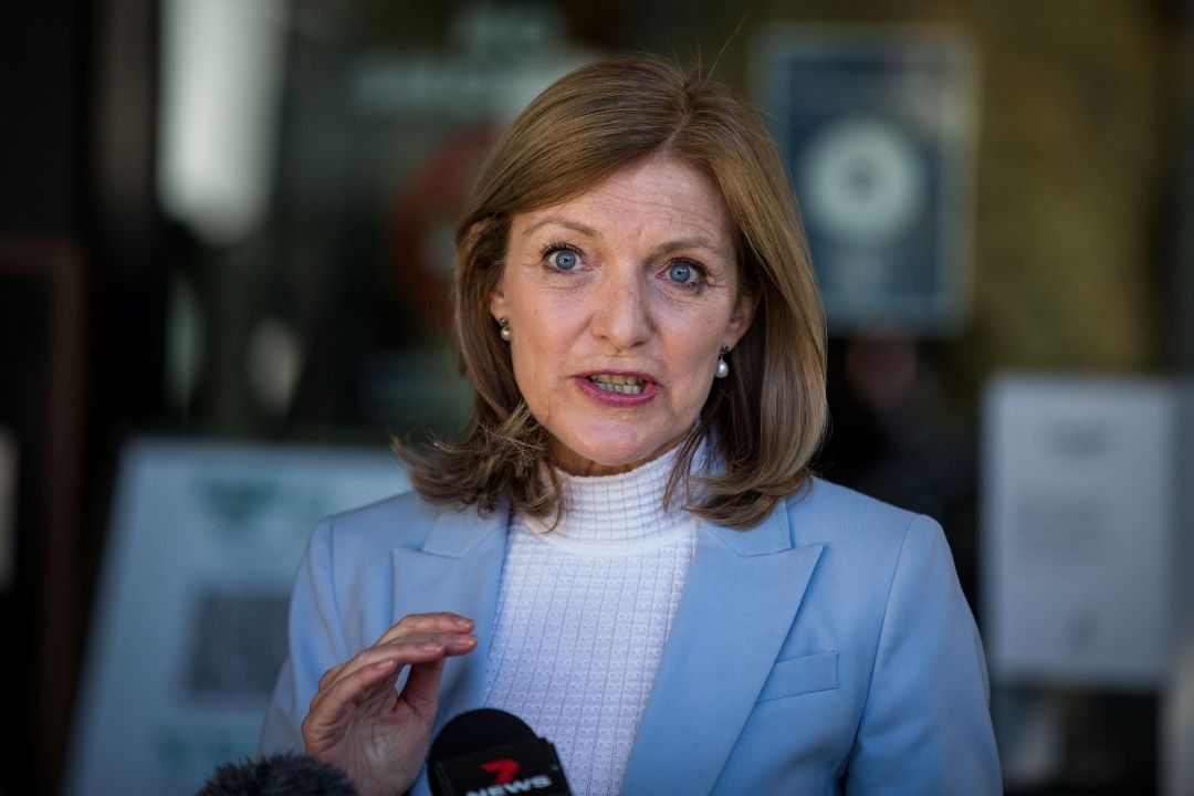 Fiona Patten of the Reason Party speaks to the media outside the Victorian Parliament on October 26, 2021, in Melbourne, Australia. (Darrian Traynor / Getty Images)