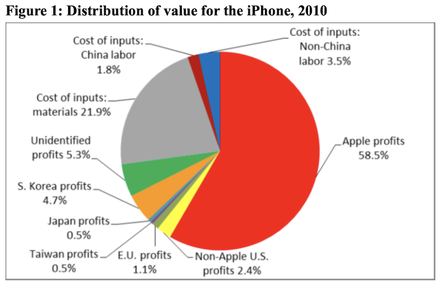 Take the example of Apple’s high-tech iPhones. According to GVC supporters, workers should benefit from employment in high-tech sectors because of their high productivity. Yet far from spreading the gains of GVC-based globalization, the production of these phones is based upon poverty wages and harsh working conditions. Apple’s profit for the iPhone in 2010 constituted over 58 percent of its final sale price, while the share going to Chinese workers was just 1.8 percent (Figure 1).