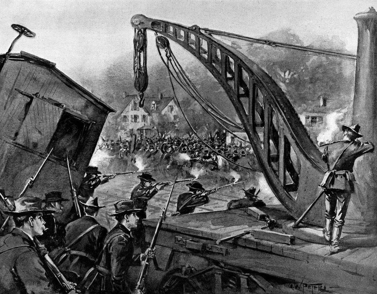 Depiction of Illinois National Guardsmen firing at striking workers on July 7, 1894. (G. A. Coffin / Harper’s Weekly) In 1926, what they finally said is, okay, Congress can step in here. If you don’t come up with a deal between the unions and the bosses, then we’re going to set up a board. We’re going to come up with a deal, we’re going to send it to Congress, and we’re going to just enforce it — at which point a strike is illegal. If you wildcat strike after that, and if the railroad company can in any way tie the wildcat strike to the union, they can sue for damages.