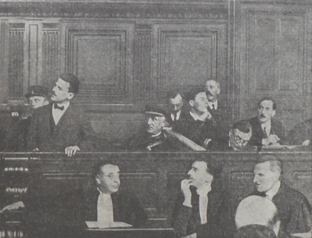 The Sholem Schwarzbard court trial in Paris, October 1927. Schwarzbard speaks in the court. Below him: Henri Torrès, his attorney. (Krasnay Niva / Wikimedia Commons)