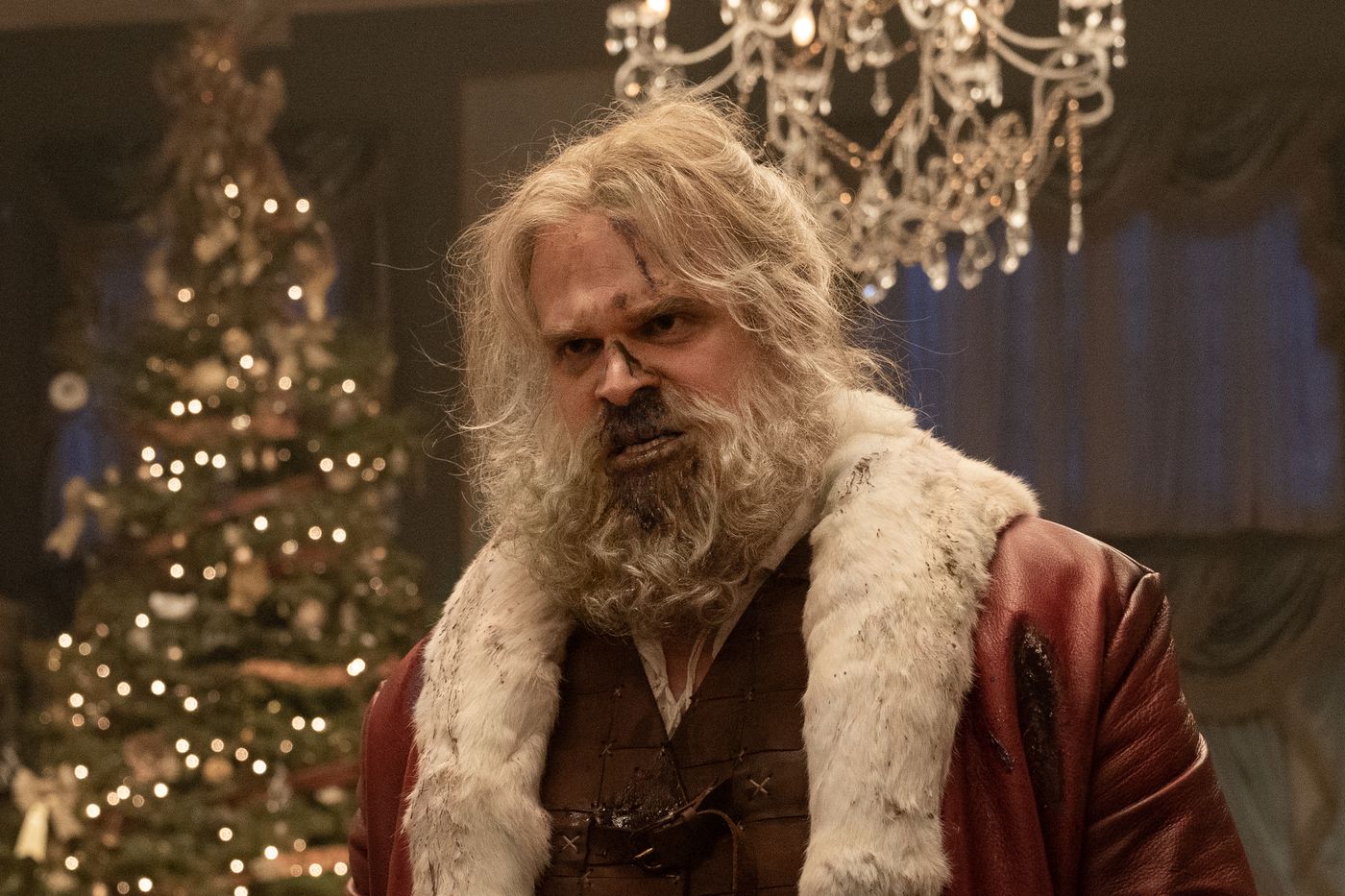 David Harbour plays an angry drunk Santa Claus in Violent Night. (87North)