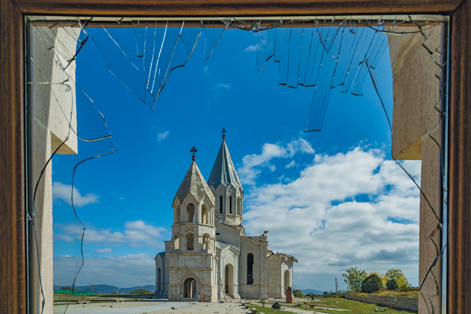 A view of the Ghazanchetsots Cathedral, an Armenian Apostolic church in Shusha, Azerbaijan, through a broken window following Azerbaijani shelling, October 11, 2020. (Celestino Arce / NurPhoto via Getty Images)