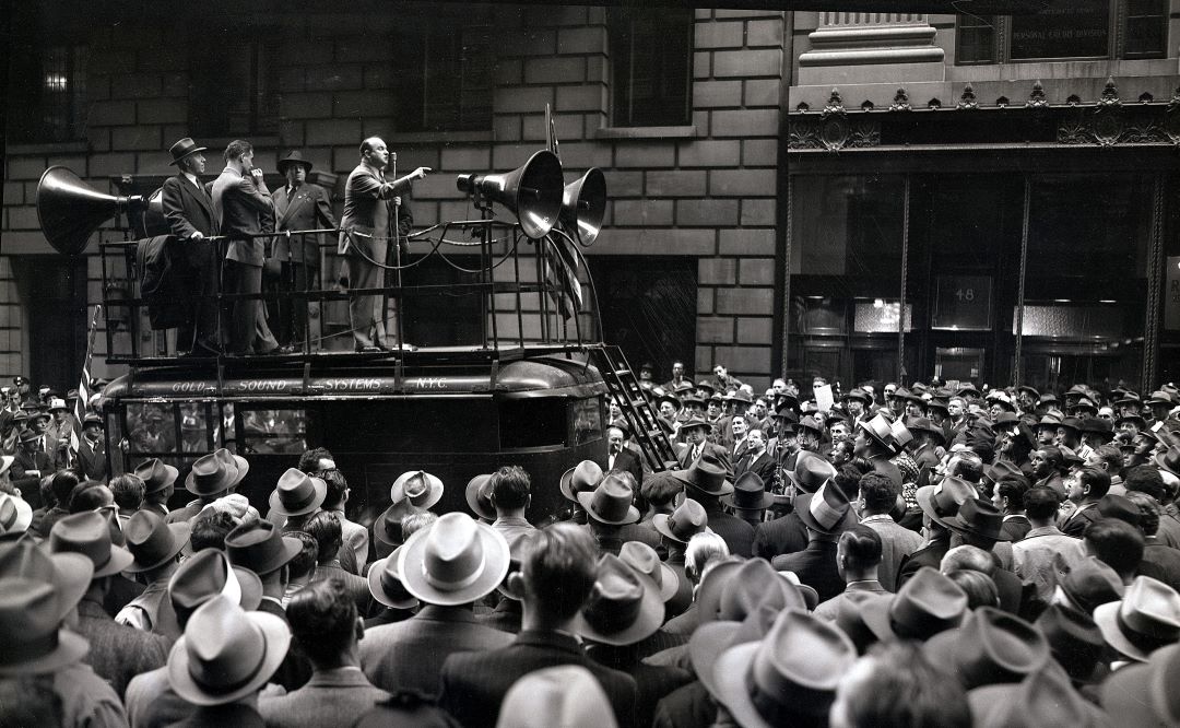 Members of the Transport Workers Union meet in New York City on November 2, 1946. Michael J. Quill, head of the union, speaks to the workers from atop a sound truck. (Bettmann / Getty Images)