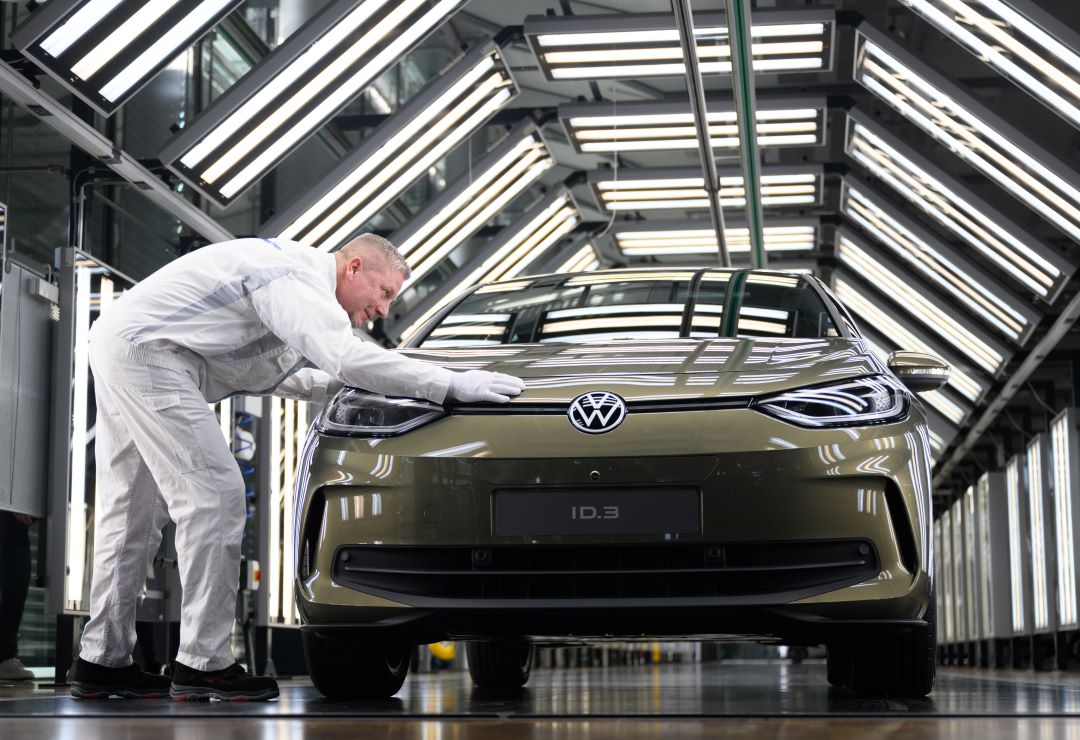 Rainer Hopp, foreman in the vehicle final inspection department at the Transparent Factory, demonstrates the final inspection of the car during a photo session on the occasion of the digital world premiere of the electric model of the Volkswagen ID.3. (Robert Michael / picture alliance via Getty Images)