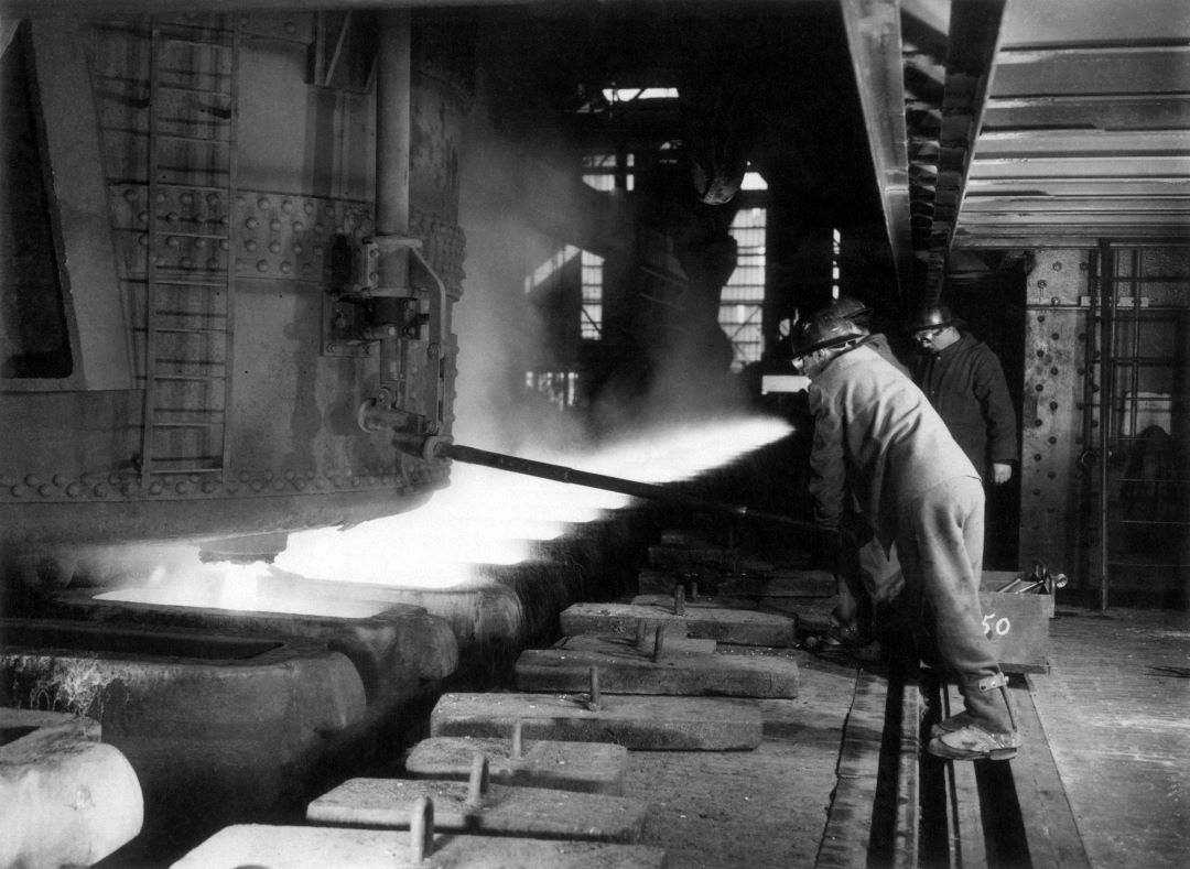 Two workers pouring the cast steel from the ladle into the ingot maker at the Cornigliano Steelworks, 1963. The Cornigliano metalworkers were the inspiration for Luigi Nono’s composition La fabbrica illuminata. (Mondadori via Getty Images).