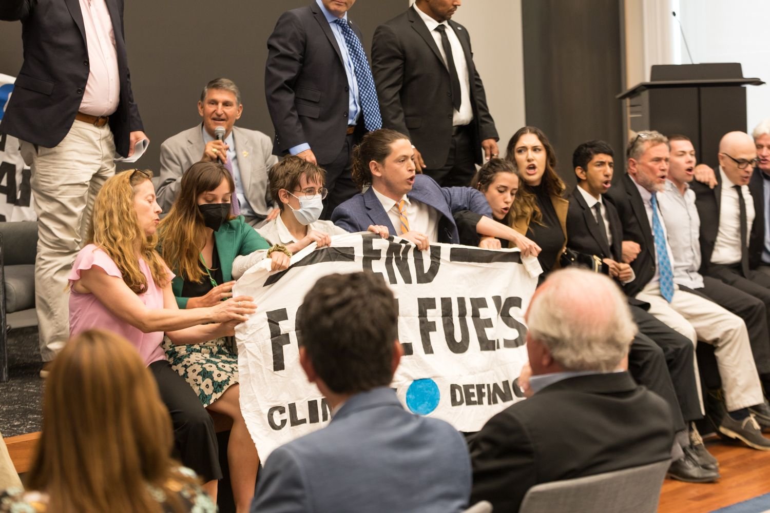 “Media outlets need to reevaluate,” said Rylee Haught, an organizer with the environmental group Climate Defiance who was involved in Tuesday’s protest. “If they’re taking giant chunks of cash from fossil fuel CEOs, they should be prepared for us to call them out at any time and shut down an event like this. When you’re platforming people like [Manchin], you need to be prepared.”