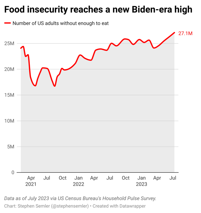 Recent data from the US Census Bureau’s Household Pulse Survey show that the number of US adults who don’t have enough to eat eclipsed twenty-seven million in July 2023 — 3.3 million more than in January 2021. And this is the fourth straight month of increasing hunger, the longest streak since the Household Pulse Survey began collecting data in April 2020.