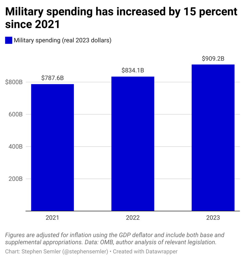 That’s probably what’s going to happen again. Lawmakers poured an additional $40 billion into military spending in FY2022 and have showered an extra $50 billion so far in FY2023. The Pentagon’s bonus bucks will likely amount to even more next year: Republican and Democratic senators are planning on larding up the next Ukraine aid bill with funding unrelated to Ukraine — in other words, billions in “emergency” spending will likely just be routine arms industry pork.