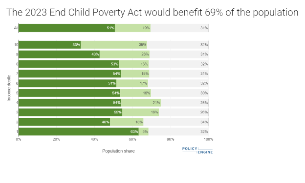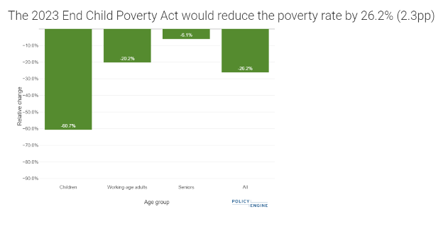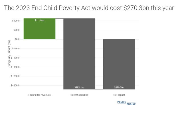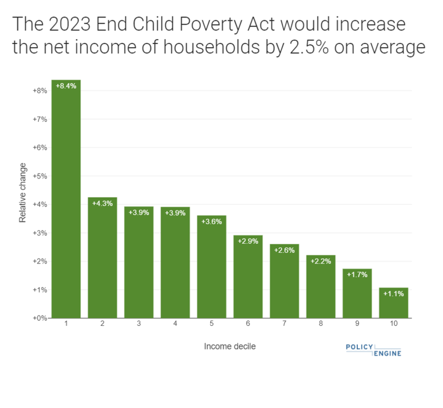 In April of this year, the End Child Poverty Act (ECPA) was reintroduced in Congress. The ECPA is a child allowance proposal that would replace the current intricate system of family tax credits with a simple, universal child benefit. The ECPA has the potential to help millions of families and significantly reduce child poverty. However, the ECPA has yet to receive a detailed analysis that estimates its cost and impact. That is, until now. Recently, I collaborated with Max Ghenis, Founder of PolicyEngine, to create an in-depth analysis of the ECPA for 2023. Using PolicyEngine, Max and I were able to determine the program’s cost and effects on household income, poverty, and inequality. This comprehensive evaluation sheds light on the true potential of the ECPA.