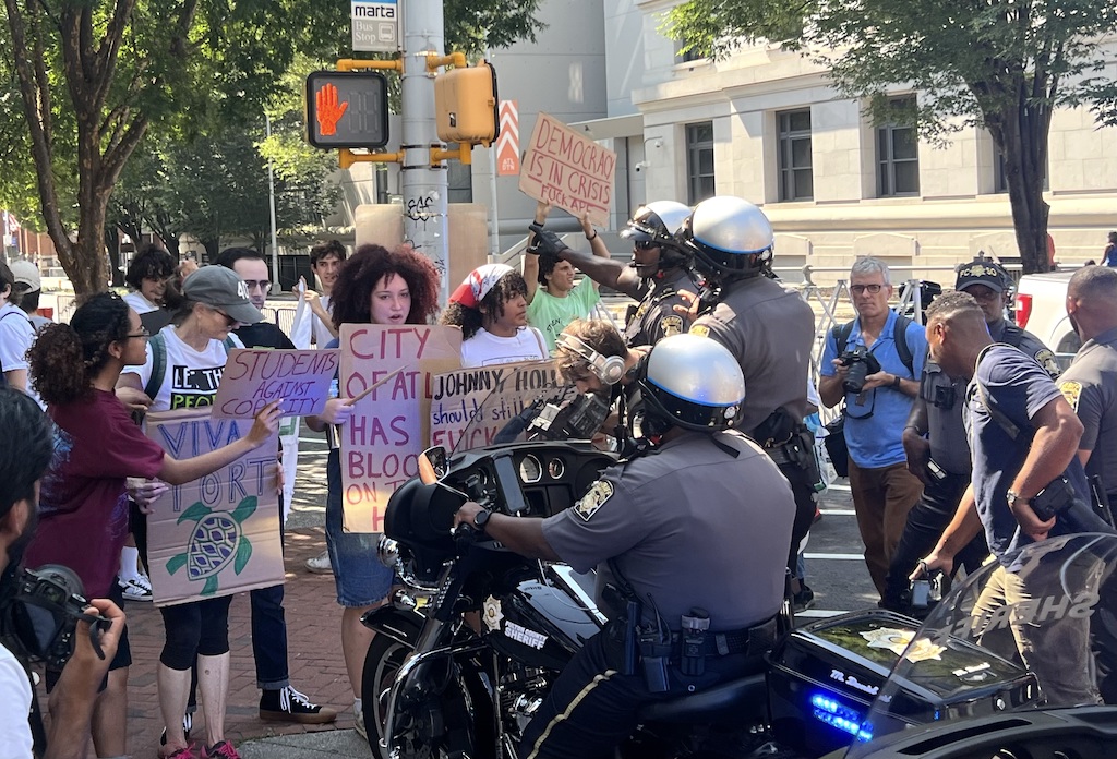 Meanwhile, several Fulton County sheriff’s deputies on motorcycles, with sirens blaring, rode on the sidewalk toward the protesters in order to force them to move a block away, to a designated free speech zone.