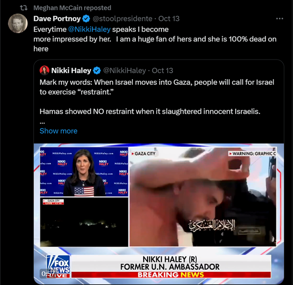 Meghan McCain, another UTA client, has similarly slammed Biden’s anti-Islamophobia initiative and has approvingly shared videos of Islamophobe Douglas Murray (who has repeatedly downplayed the Nazi Holocaust) mocking the concept of military proportionality as a “fetish” and “obsession,” and of Nikki Haley insisting that Israel must not exercise “restraint” in its bombing of the densely populated enclave.
