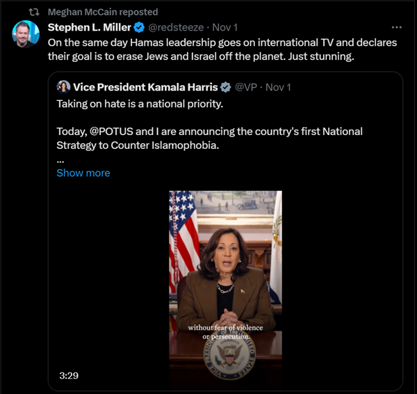 The point is that there are wildly different standards by which people are being held. If you speak out for Palestinian rights, so much as criticizing Israel’s war too harshly or simply failing to put enough emphasis on the lives taken by Hamas, you can get fired or publicly tarnished. If you back Israel’s war, you can openly advocate for more violence, justify war crimes and the killing of children, and say hateful things about Muslims and Arabs or endorse those who do, and face absolutely no repercussions.