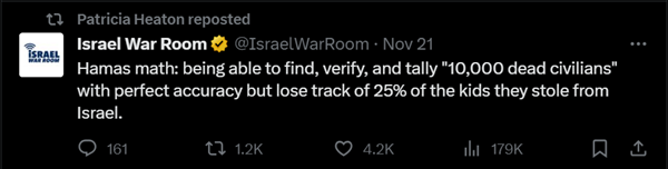 Last Tuesday, Heaton retweeted a post from pro-war account Israel War Room, which placed scare quotes around the death toll of ten thousand Palestinians, implying that the figure was false or exaggerated. (This talking point has been repeatedly debunked, with a state department official recently saying the death toll could in fact be much higher). Heaton has continuously spread the equally debunked “Pallywood” conspiracy theory, which holds that the images of dead Palestinians we’re seeing are actually fake and staged by actors.