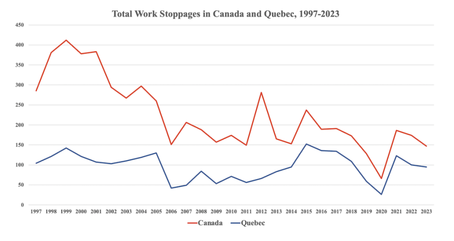 While Quebec has experienced similar trends, the decline in labor’s power within the province has been less severe than nationally. Total work stoppages in Quebec dipped in the decade between 2005 and 2015 but have since largely returned to levels observed in the late 1990s, with the exception of the period preceding and during the pandemic.